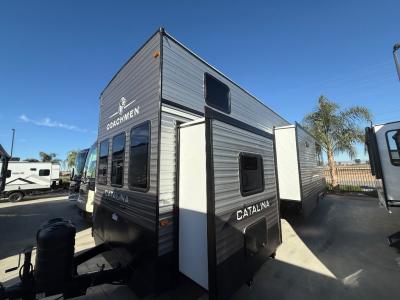 With any Catalina Destination trailer by Coachmen, you will enjoy comfortable extended stays wherever you decide to set up camp! The full length frame outriggers add strength to each unit, along with a seamless Alpha Roof membrane and Norco electromagnetic, powder coated chassis. You will love the open views provided by the residential-style sliding glass patio door, plus there are GE appliances, woodplank linoleum flooring, and hard valance window treatments to make your space feel more like home. Head outside to find a convenient "Leash Link" quick hookup D-ring for your furry friends, premium JBL exterior speakers, flush mount baggage doors for your gear, and the list of amenities goes on!
