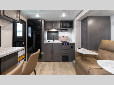 If you're looking for a couple's or solo travel trailer, this is the one! Once you arrive at the campground, you can unload the pass-thru storage, put out the 16' awning, and start lunch on the outside kitchen. The walk-thru bath is spacious and includes a spacious linen closet to keep dry towels close by. There is a theater seating slide out where you can relax each day, plus a bar top with two stools and a flip-up window for dining space. And the rear kitchen includes everything you need to cook meals when the weather isn't cooperating outside.