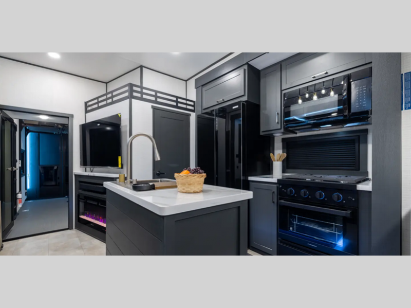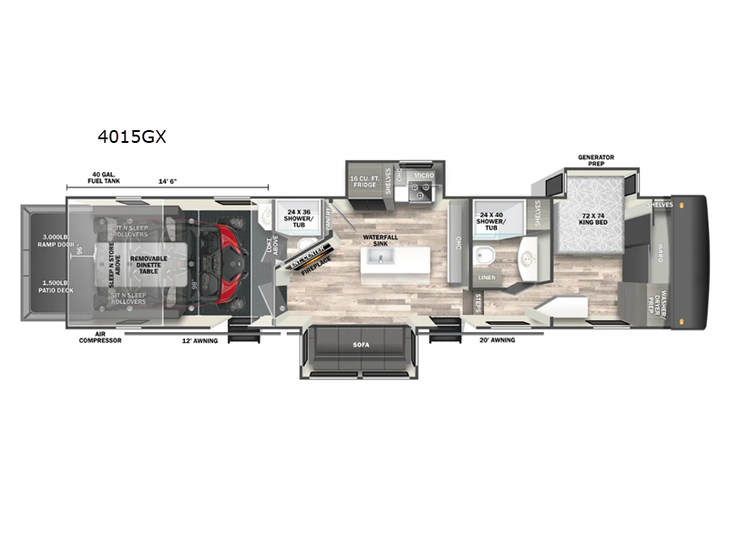 Sleeps 6 Length 34 ft Ext Width 8 ft 6 in Ext Height 13 ft 4 in Hitch Weight 2139 lbs GVWR 14139 lbs Dry Weight 9411 lbs Cargo Capacity 4728 lbs Fresh Water Capacity 114 gals Grey Water Capacity 65 gals Black Water Capacity 40 gals Generator 4.5k NPS Fuel Capacity 40 gals Number Of Bunks 1 Available Beds King Refrigerator Type 12V Refrigerator Size 10 cu ft Convection Cooking Yes Cooktop Burners 3 Number of Awnings 1 Garage Size 15 ft 7 in LP Tank Capacity 20 lbs Water Heater Type Tankless AC BTU 15000 btu Axle Count 2 Number of LP Tanks 2 Shower Type Radius Similar Floorplans