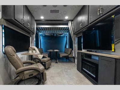 Sleeps 6 Slides 1 Length 36 ft 5 in Ext Width 8 ft 6 in Ext Height 12 ft 9 in Hitch Weight 1855 lbs GVWR 13855 lbs Dry Weight 9399 lbs Cargo Capacity 4456 lbs Fresh Water Capacity 102 gals Grey Water Capacity 80 gals Black Water Capacity 40 gals Tire Size 16" Furnace BTU 35000 btu Fuel Capacity 40 gals Number Of Bunks 1 Available Beds King Refrigerator Type 12V Refrigerator Size 10.7 cu ft Convection Cooking Yes Cooktop Burners 3 Number of Awnings 1 Axle Weight 6000 lbs Garage Size 15 ft 7 in LP Tank Capacity 30 lbs Water Heater Type Tankless AC BTU 15000 btu Awning Info With LED Lights Axle Count 2 Number of LP Tanks 2 Shower Type Radius Solar Wattage 200 watts Similar Toy Hauler Travel Trailer Floorplans